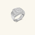 The Magistrum Men’s Diamond Ring features a bold square cluster framed with shimmering diamonds, set on a wide silver band. A powerful symbol of prestige and sophistication.